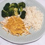 Cuando termine el tiempo, separamos las pechugas a un lado y batimos en un procesador el caldo que ha soltado el pollo y las verduras para obtener una deliciosa salsa de curry y coco.