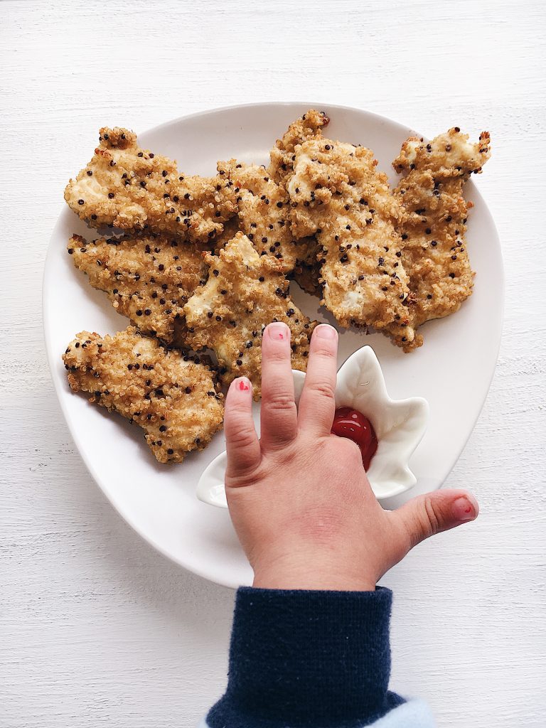 Pasamos cada trozo por harina, huevo y quinoa cocida (en este orden), y los vamos colocando sobre el papel de hornear en la bandeja.