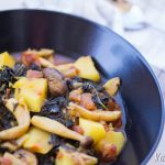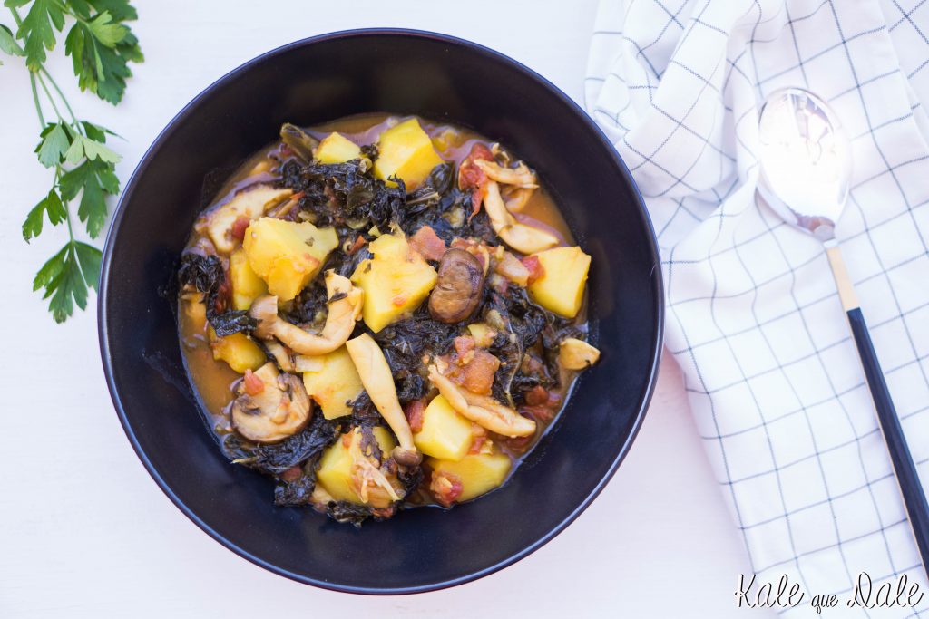 Añadimos las hojas de Kale y las patatas y rehogamos todo junto, 3-4 minutos. Después echamos el caldo y un pellizco de sal. Dejamos cocer todo a fuego bajo durante 25 minutos (o hasta que veamos que las patatas estén bien hechas)