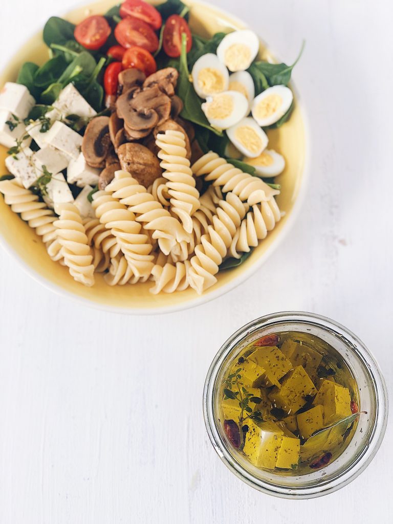 He oído muchas veces que el tofu «no sabe a nada», y puede que su ausencia de sabor sea algo característico, por eso en casa lo solemos tomar marinado con soja, o sésamo, y en este caso lo he dejado en aceite para darle un toque especiado.